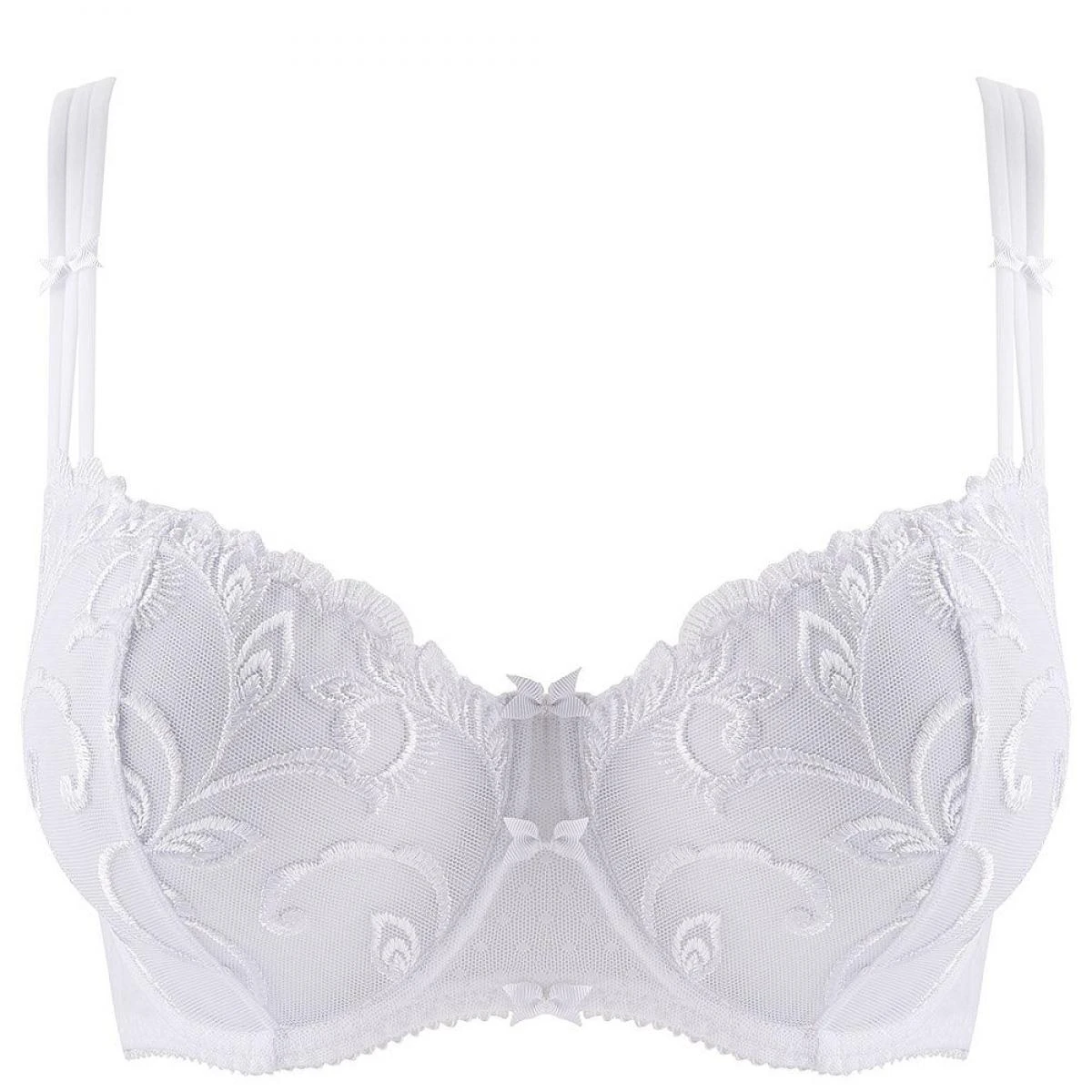 Les bonnets couvrants de ce soutien-gorge corbeille sont couverts de tulle plumetis blanc brodĂ©s de magnifique arabesques florales pour un effet des plus raffinĂ©s. Les broderies continuent sur le haut des bonnets pour un dĂ©licat effet de matière qui sublimera votre dĂ©colletĂ©. L’entre-bonnets est travaillĂ© et ornĂ© de 3 nĹ“uds de satin blanc, ajoutant encore en romantisme Ă cette pièce.