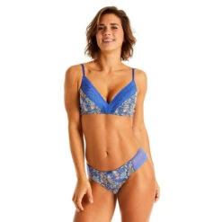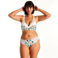 La coupe classique est magnifiée par des détails élégants et soignés comme les rayures verticaux sur les bonnets, le petit nœud satiné à l’entre sains et les détails fantaisies sur les bretelles.