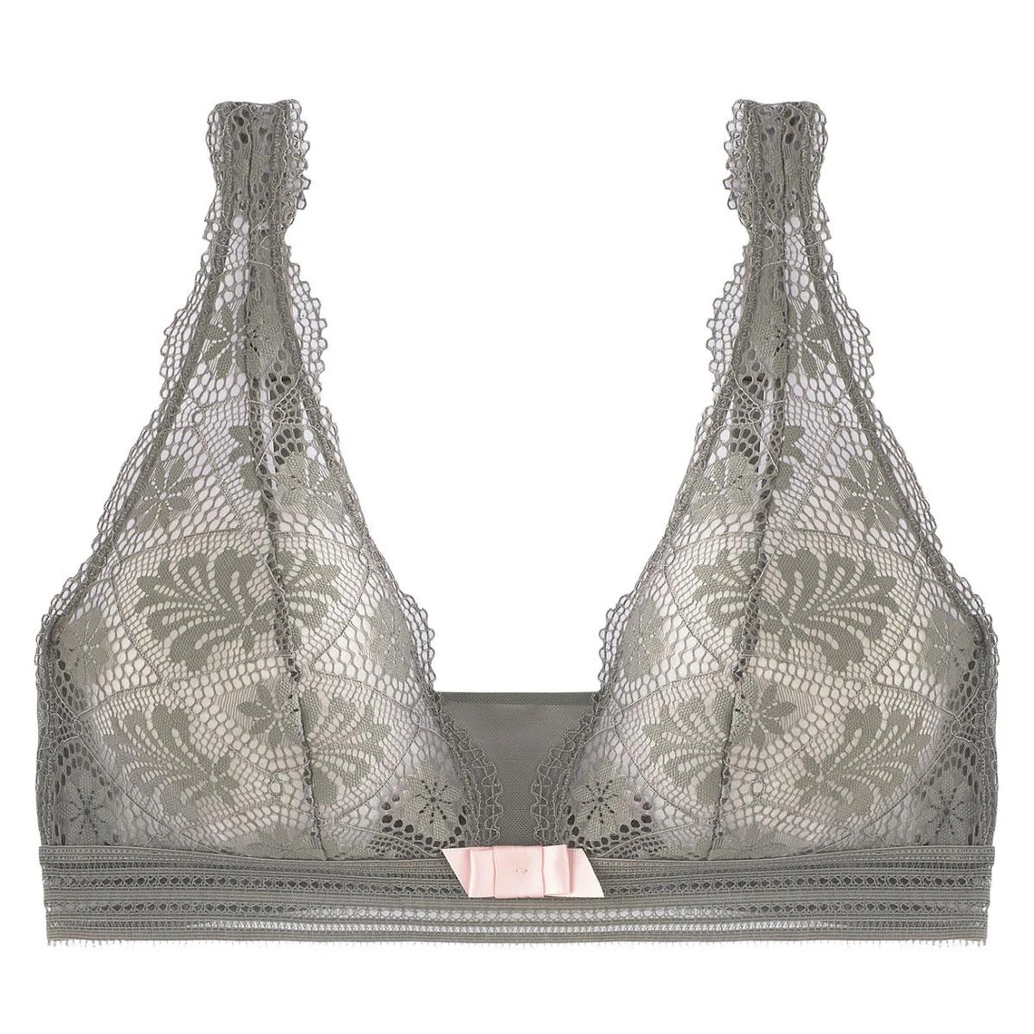 Soutien-gorge triangle sans armature. Dentelle effet fleur de Lys. Bretelles plates. Basque galon Ă©lastiquĂ©. NĹ“ud satin rose poudrĂ© Ă l’entre-seins. Agrafage 2 attaches sur 3 positions.