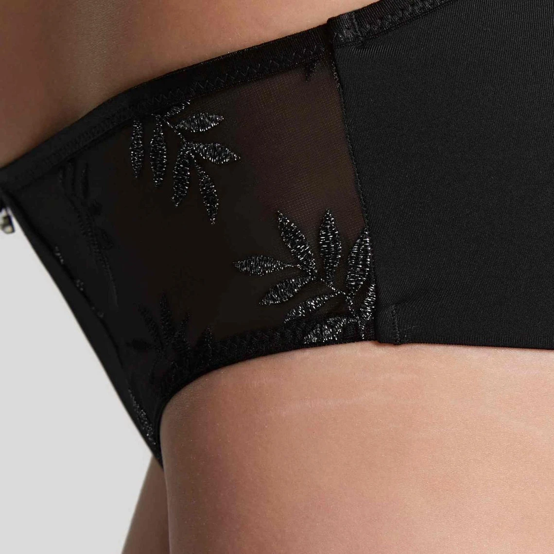 A l’avant, il est conçu dans un tulle brodé d’un motif feuillage. Ses bonnets sont partiellement doublés et armaturés, garantissant maintien et galbe. On retrouve à l’entre-seins un discret bijou éclatant.