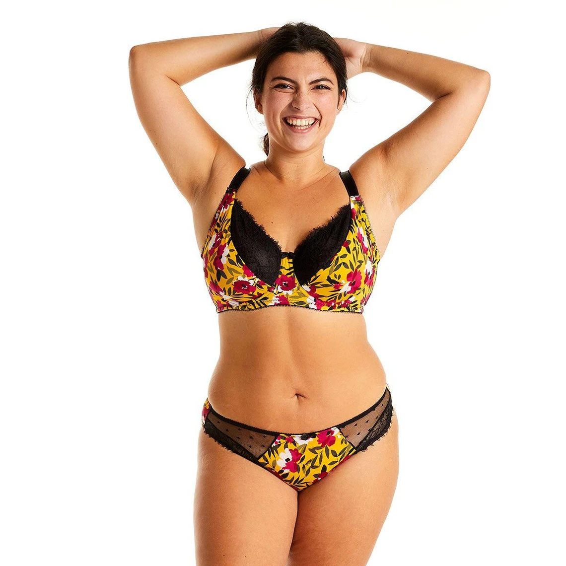 Soutien gorge armatures en microfibre imprimée au motif « fleurs aquarellées ». Décolleté classique avec galon de dentelle florale finition effet de cils. Forme emboitante. Bonnets doublés d’une matière douce et rigide. Noeud fantaisie à l’entre-seins. Basque élastiquée sous poitrine. Finitions dos cheminée. Bretelles larges et réglables. Fermeture 3 agrafes 3 positions. Disponible du 95C au 110F