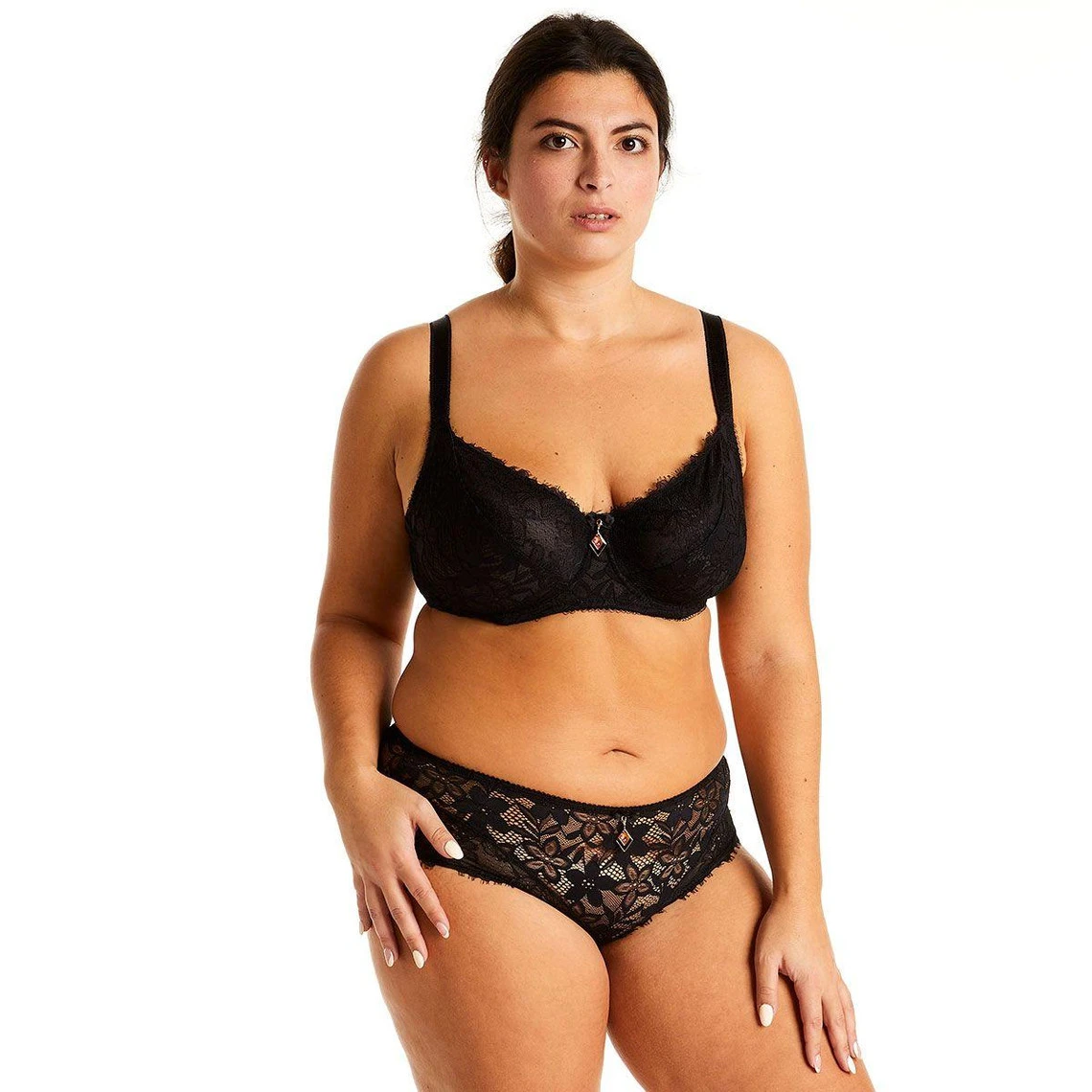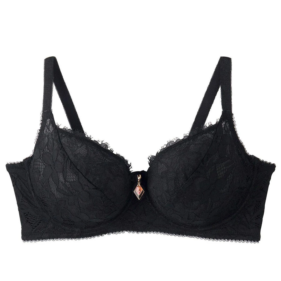 Soutien gorge armatures tout en dentelle florale finition effet de cils. Décolleté classique avec galon de dentelle. Forme emboitante. Bonnets doublés d’une matière douce et rigide. Noeud fantaisie et bijou émaillé amovible à l’entre-seins. Basque élastiquée sous poitrine. Tulle plumetis sur les ailes. Finitions dos cheminée. Bretelles larges et réglables. Fermeture 3 agrafes 3 positions. Disponible du 95C au 110F
