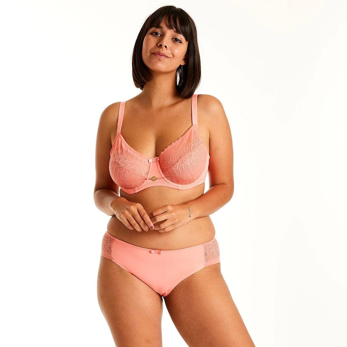 Soutien gorge armatures en microfibre unie et bande de dentelle géométrique. Décolleté classique. Forme emboitante. Bonnets doublés d’une matière douce et rigide. Bijou métallique à l’entre-seins. Basque élastiquée sous poitrine. Finitions dos cheminée. Bretelles larges et réglables. Fermeture 3 agrafes 3 positions. Disponible du 95C au 110E