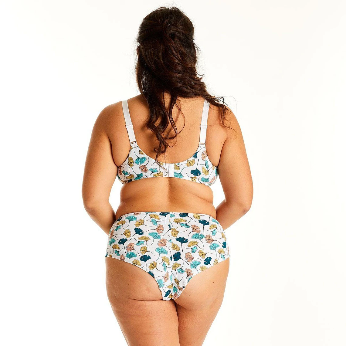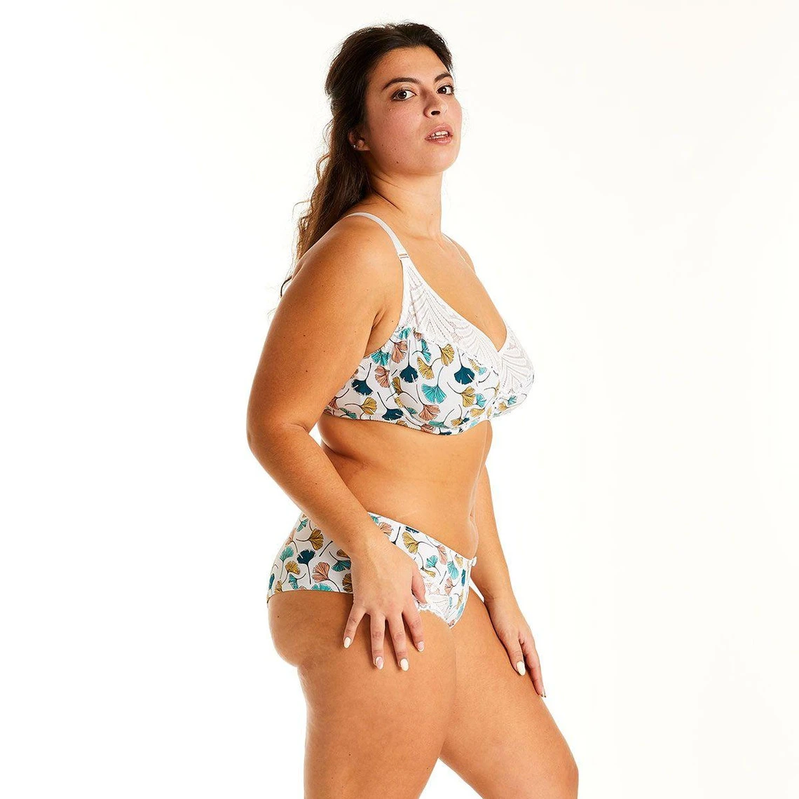 Il est proposé avec un brin d’authenticité et d’élégance. On aperçoit ses bonnets joliment décorés par des motifs de fleurs colorés rejoignant le haut de la pièce. Marqué par des bonnets bien épais et triangulaires, on peut admirer une poitrine très flatteuse. Ses bretelles assurent un excellent maintien, complétées par un système d’agrafage à l’arrière.