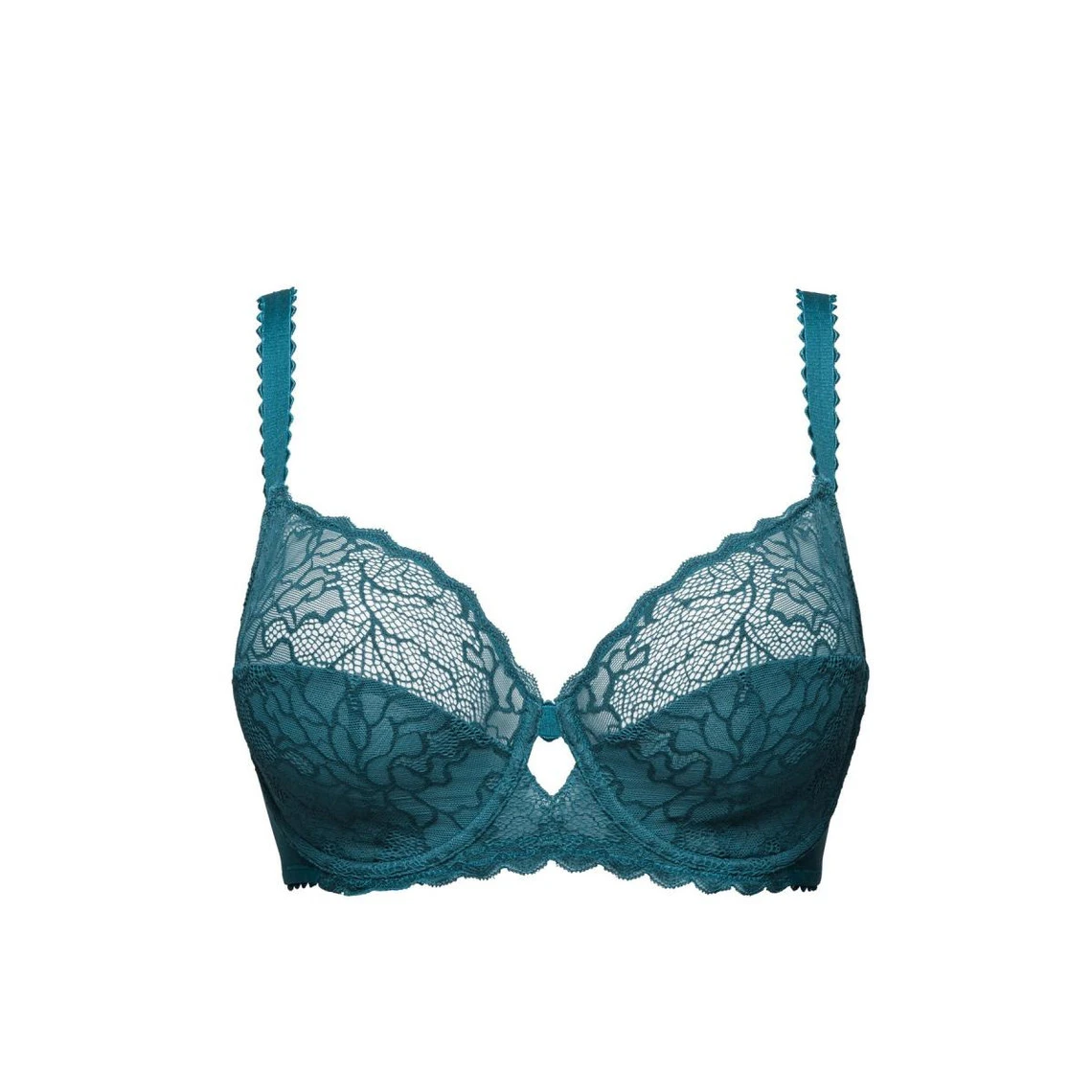Sa forme emboîtant englobe et offre un maintien parfait aux poitrines généreuses. Les bonnets sont conçus en dentelle à motifs d’inspiration marine pour une allure moderne et élégante. L’entre-sein ajouré ajoute une note sexy à toute la pièce.
