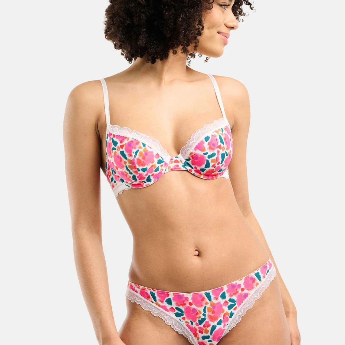 A la pointe de tendance, ce soutien-gorge est enrichi d’imprimé floral multicolore pour une allure pétillante. Il offre beaucoup de maintien et de confort grâce à ses bonnets enveloppants. Les armatures assurent un maintien parfait durant son port. Pour une touche de charme, le décolleté et le basque sont soulignés d’un galon de dentelle.