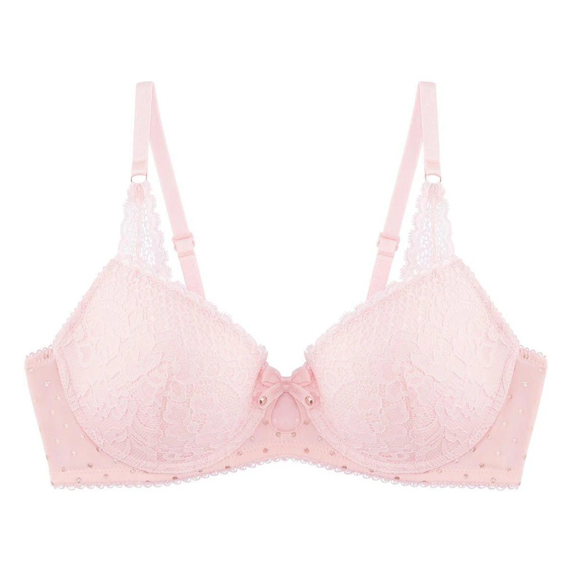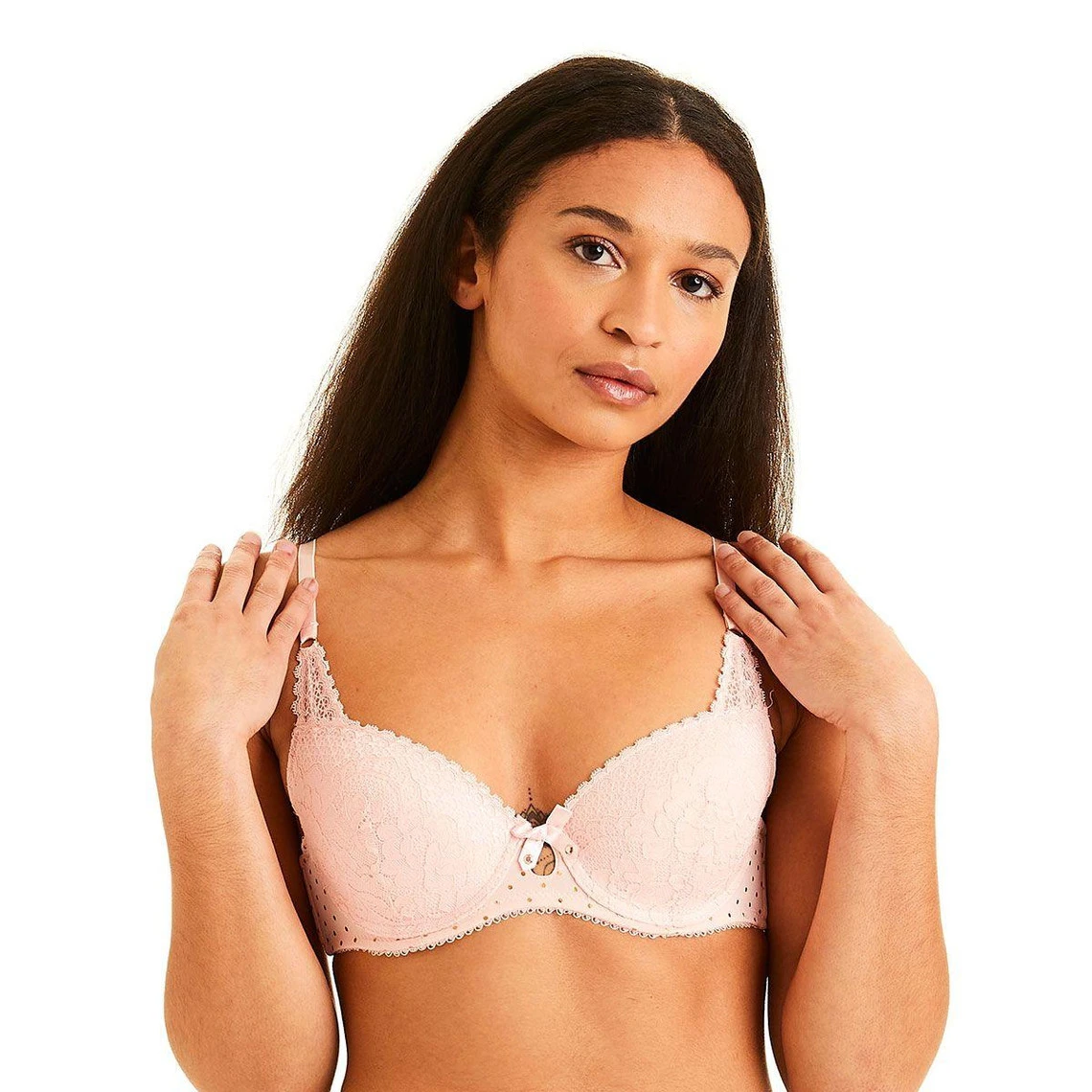 Dotés d’armatures et de coques moulées, ses bonnets fournissent aux seins un excellent maintien. Ils sont recouverts d’une belle dentelle raffinée. Le départ des bretelles sont en dentelle, tandis que la basque et le dos en microfibre à imprimé à pois. L’entre-seins est sublimé par un bijou et un nœud satiné.