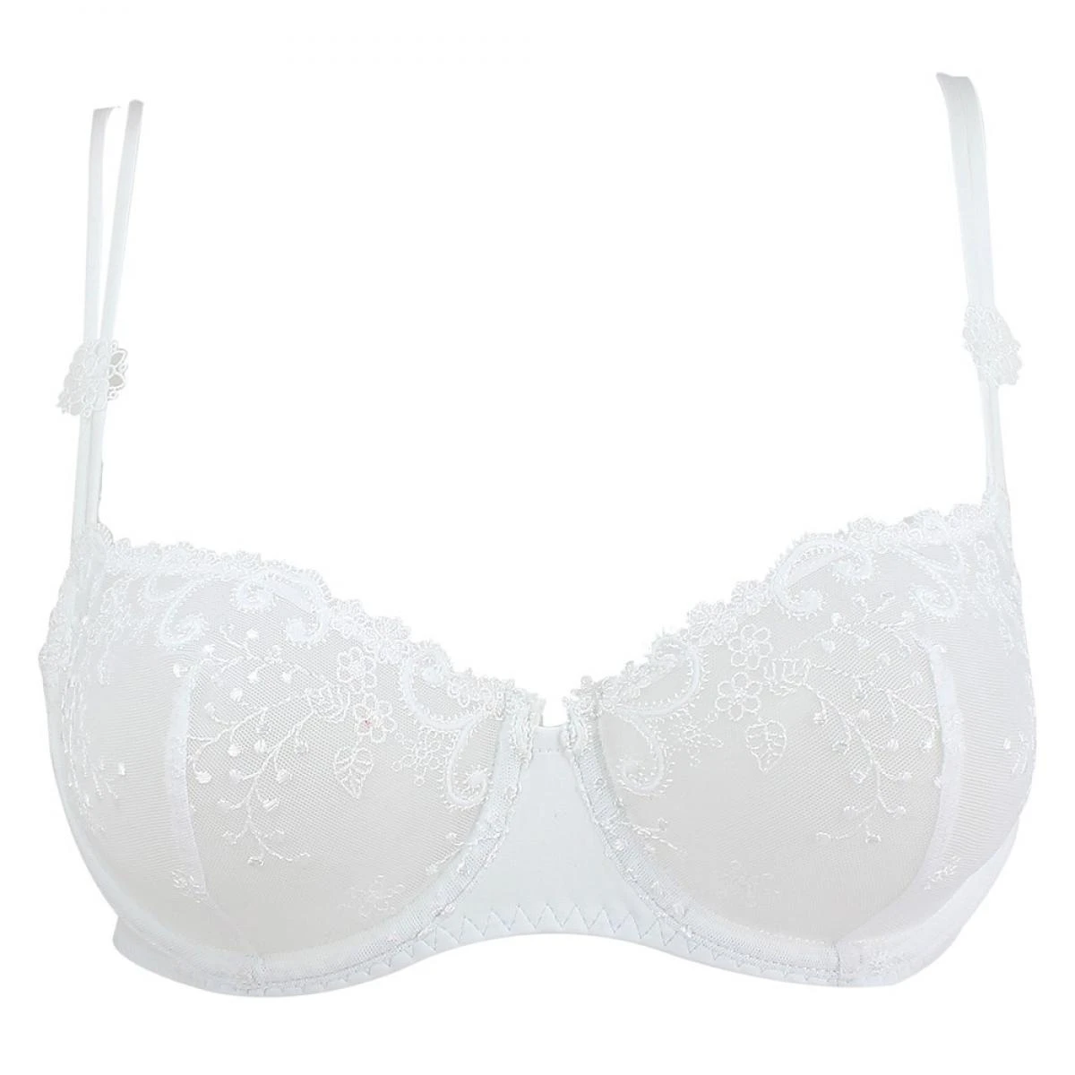 Le soutien-gorge corbeille blanc Simone Pérèle est un classique poétique à avoir dans son dressing lingerie. Les bonnets en tulle blanc doux sont d’une incroyable légèreté et finesse. Sa forme corbeille vous offre une poitrine avec un décolleté pigeonnant séduisant. Les broderies sur les bonnets blanc sont un mélange de fleurs délicates et d’herbes folles. L’entre-bonnet possède une découpe tendance. Il se compose de maille microfibres d’une douceur incomparable. Les bretelles blanches sont en spaghettis, avec un point de reliure au niveau de la guipure en forme de fleur rosace. Ces deux guipures sont très délicates avec des bordures fines donnant toute la féminité aux bretelles. Le tour de dos se compose également de maille blanche microfibres ultra douce. Un sigle SP argenté rappelant la marque Simone Pérèle se pose sur la fermeture du soutien-gorge blanc. La fermeture se fait à l’aide de deux agrafes réparties en trois crans.