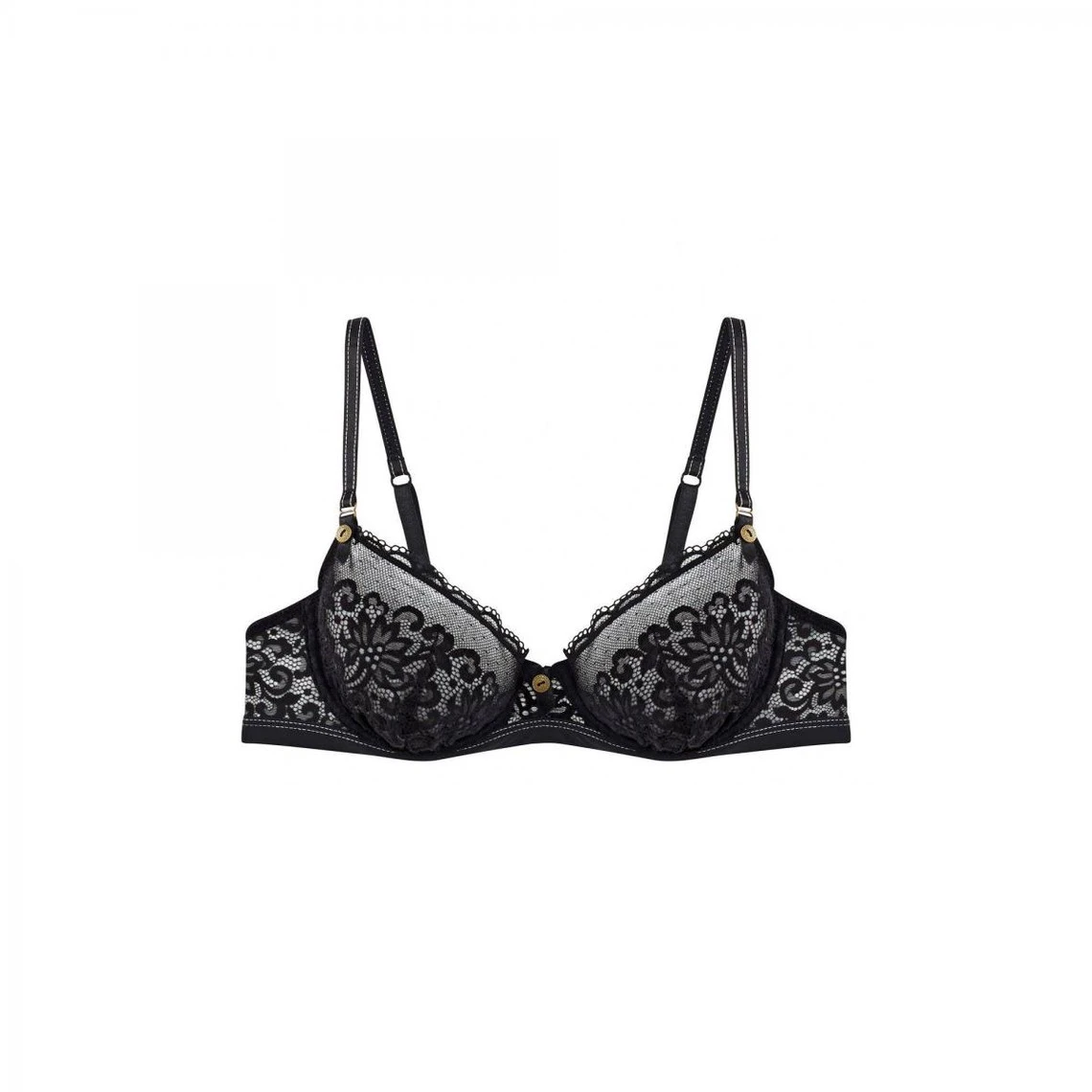 Soutien-gorge à armatures en dentelle florale et féminine. Bonnets entièrement doublés de tulle. Départ des bretelles travaillé avec un accessoire métallisé reliant la bretelle au bonnet. Bretelles fantaisie avec surpiqûres contrastées à l’avant, réglables et plates dans le dos. Bouton fantaisie métallisé associé a un ruban satiné réhaussant l’entresein et le départ de bretelle. Un biais en microfibre finition double surpiqûres contrastées souligne la basque en dentelle. Baleine de confort sur les côtés, dos en microfibre. Agrafe 2×3 positions.