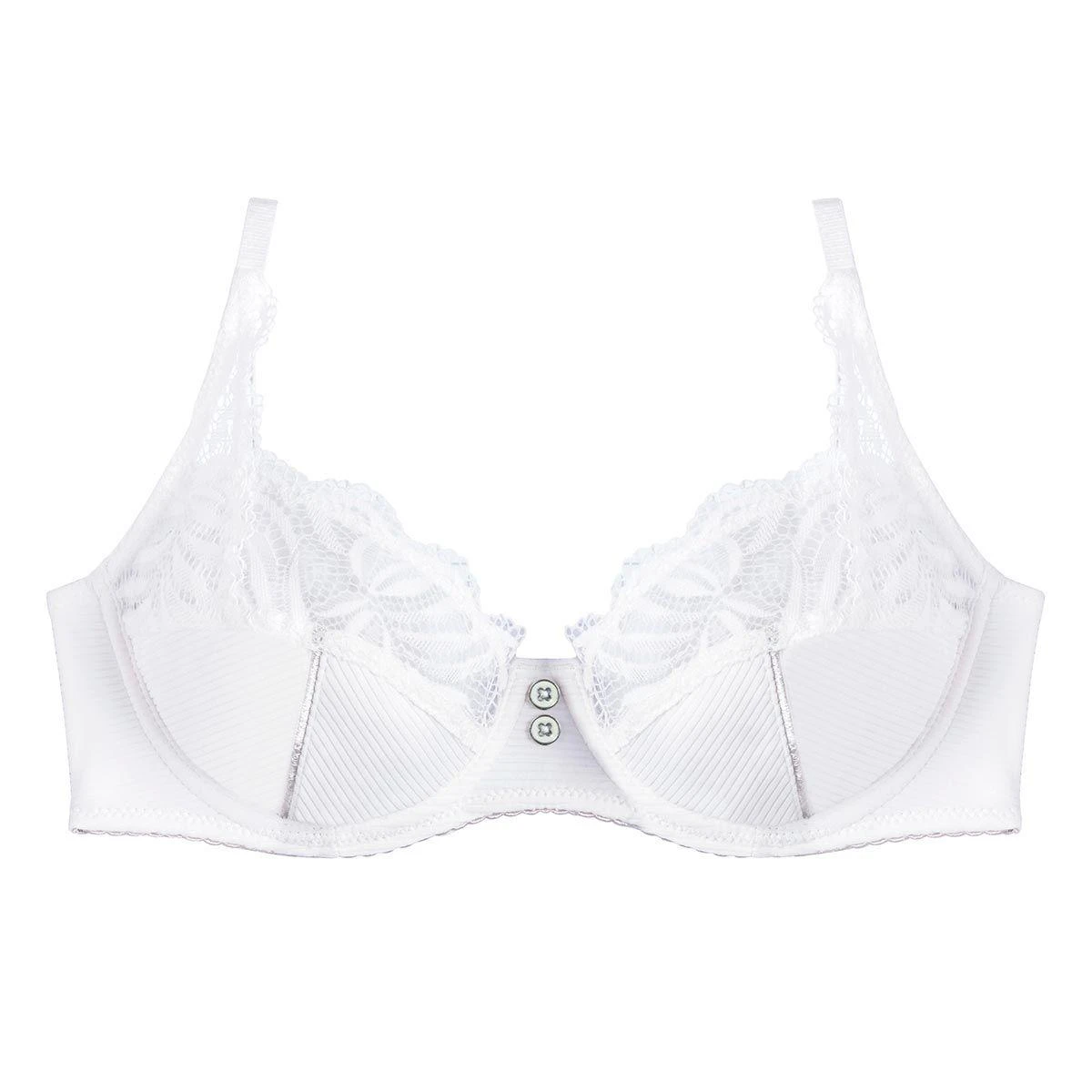 Soutien-gorge armatures. Dentelle florale. Microfibre jacquard. 2 boutons émaillés à l’entre-seins. Bretelles larges réglables. Dos droit et doublure tulle. Fermeture 2 agrafes, 3 positions. Disponible du 85B au 95D