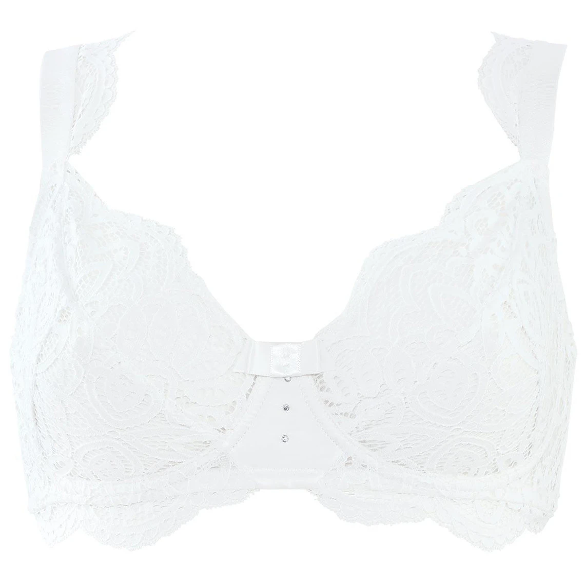 Soutien-gorge armatures. Dentelle florale sur les bonnets et la basque. Tulle fantaisie sur les ailes.Nœud satin et strass à l’entre-seins. Bretelles fantaisies en dentelle larges réglables. Fermeture 3 agrafes, 3 positions. Disponible du 85D au 110E.