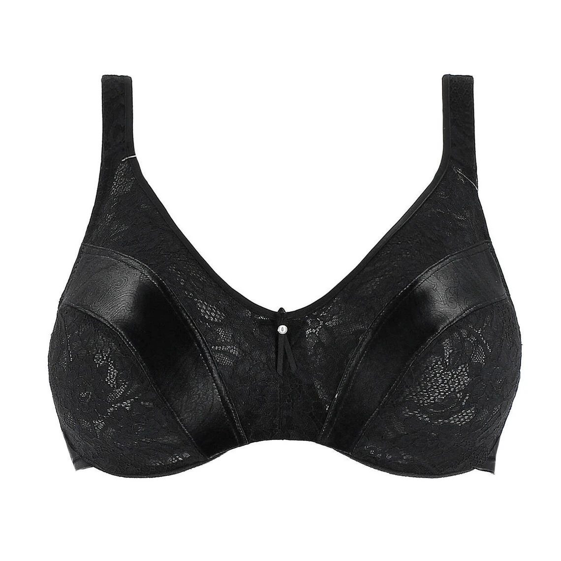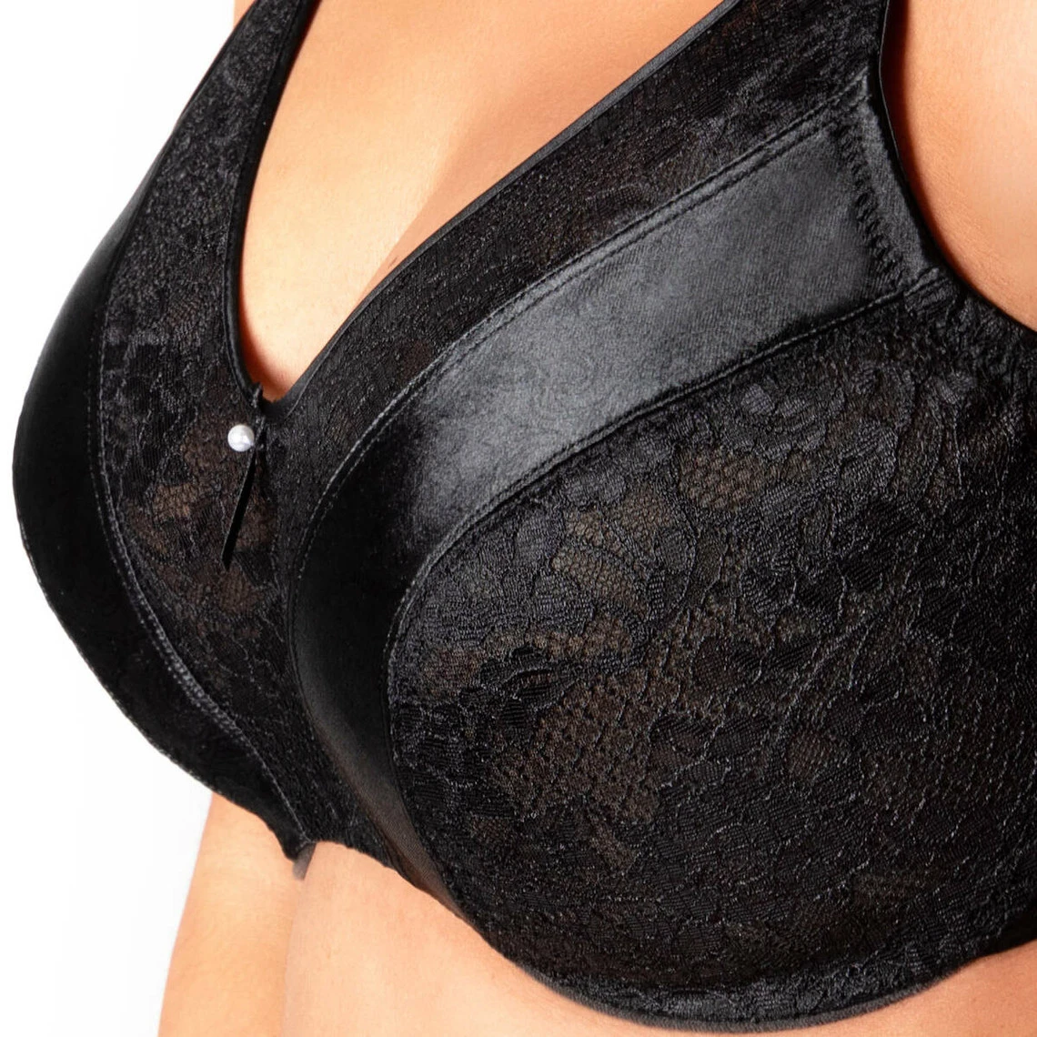 Des bandes de stretch de satin jacquard sont disposĂ©s au milieu des bonnets. Elles apportent l’aisance nĂ©cessaire au sein pour trouver sa place dans le bonnet. De la dentelle Leavers bloquĂ©e est cousue au satin par deux coutures plates pour un bonnet parfaitement construit.