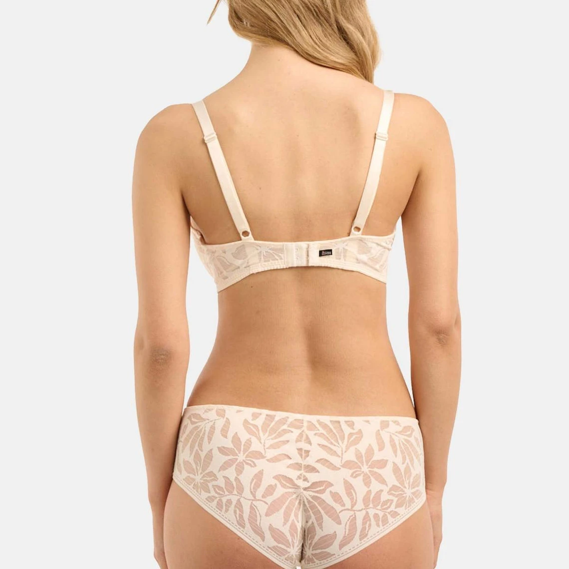 Il est réalisé dans une belle dentelle florale délicate et se veut extrêmement féminin et sensuel. Ses bonnets sont doublés de tulle et s’accompagnent d’armatures solides pour plus de confort et de maintien. Ils garantissent un sublime galbe de la poitrine. Le découpe à l’entre-seins accentue sa féminité.