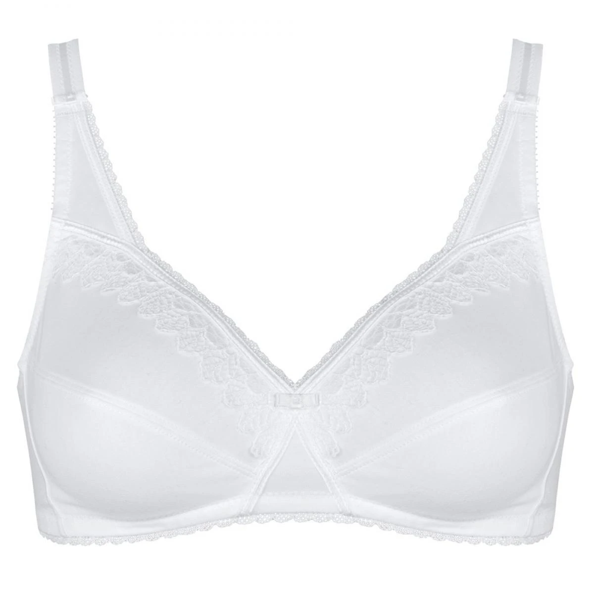 Le soutien-gorge sans armatures Playtex blanc se compose de 86 % de coton pour un confort inégalable ! Sa forme emboitante couvre la poitrine et la couvre de douceur pour passer une journée tout en confort. Des bandes de dentelle blanches sont disposées dans le décolleté pour donne une touche très féminine. Un élastique est placé sous les bonnets et se termine à la fermeture au dos, pour permettre un bon maintien, sans armatures. Des très jolis picots blancs se trouvent dans le décolleté et remontent sur les bretelles. Ils se trouvent aussi sous la bande élastique sous les bonnets. Un petit noeud en satin blanc se pose sur les bretelles et un autre au niveau de l’entre-sein. Le tour de dos est en forme de dos cheminé, pour un meilleur maintien. Des bandes de satin blanc se croisent sur les bonnets.