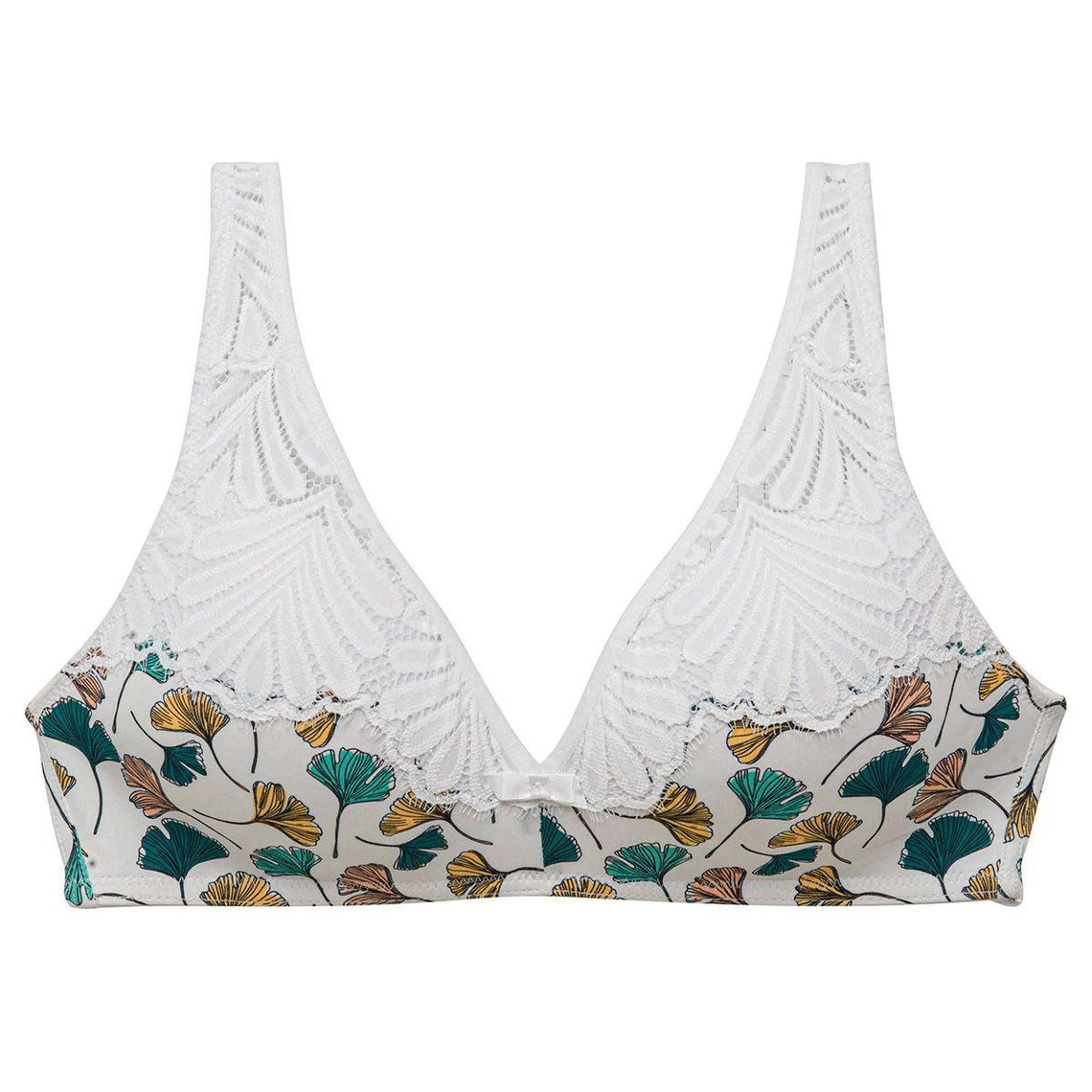 A l’avant, ce modèle mêle une belle dentelle ajourée à une maille à imprimé floral. Il se pare de bonnets doublés qui assurent un excellent maintien et un galbe naturel de la poitrine. On aime le style en V de l’encolure, formant un sublime décolleté.
