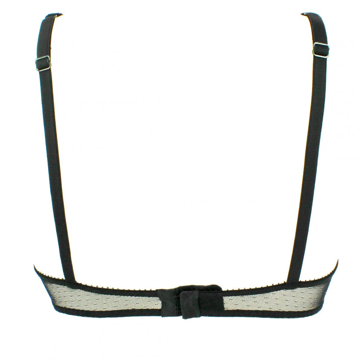 Le soutien-gorge triangle est une forme tendance et charmante. Cette forme est sans armatures. Il se compose par des bonnets dentelle noire aux motifs fleuris et des bordures aux belles vaguelettes et cil qui habillent votre poitrine en toute fĂ©minitĂ©. La partie centrale des bonnets est doublĂ©e d’un tulle noir apportant un peu plus d’opacitĂ© et de confort sur les seins. Une bande un peu plus large sous les bonnets reprend lĂ©gèrement l’esprit bustier, très mode. La dentelle cil dĂ©borde Ă©galement sous les bonnets. Le dos du soutien-gorge triangle est en tulle plumetis noir Ă©lastique avec de jolis petits pois noir. La fermeture de cette jolie pièce de lingerie se fait grèce Ă deux agrafes Ă rĂ©gler sur trois crans. Les bretelles noires sont simples et rĂ©glables.