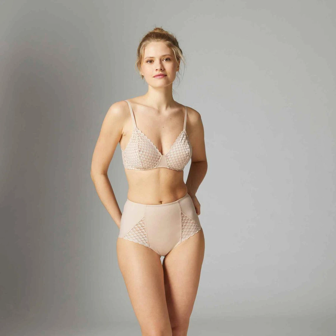 Avec ses bonnets de forme triangulaire, il emboite idéalement les poitrines généreuses. L’absence d’armatures offre un confort optimal au porter. Une dentelle graphique fait l’avant et le dos de ce dessous. Il crée ainsi une allure moderne et élégante à souhait.