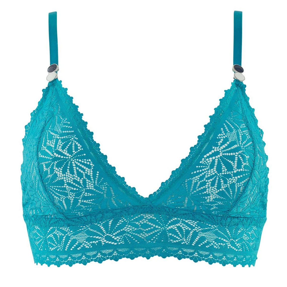Soutien-gorge triangle sans armature. Dentelle florale. Basque large élastiquée.Bretelles fines réglables. Fermeture 3 agrafes, 3 positions. Disponible du 85A au 95B.